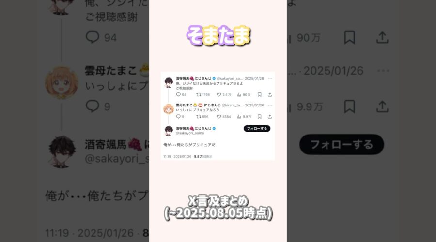 ※2025.08.05時点のものです。検索機能を使った為時系列と漏れはご了承ください。 〈SNS〉 X→ https://x.com/sakayori_soma https://x.com/kirara_tamako Y …